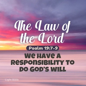 The Law of the Lord when kept, brings peace and harmony. Based on ancient codes of conduct, the commandments were considered the basis for civilized society. Think about it. What would the world be like if there was no respect for authority, or life or truth? What if there was no way to stop anyone from taking away your property? How would you feel if every day, you walked down the street and were in danger of being killed and there was no law to convict the murderer? We need laws to protect us. We need laws to remind us of our responsibilities to one another and we need the commandments to remind us of our dependence on and responsibilities to God. If we want our hearts to rejoice, we need to recognize that God is in charge, not us. When we realize this, we are set free. Of course we have a responsibility to do God's will, but it's nice to know that we aren't in control. Our responsibilities are set out in the 10 commandments that follow. Life is so much simpler if we just follow them. Stealing, lying, cheating, holding on to anger, destruction of property as well as reputations may bring a momentary benefit, but if you wouldn't like to be on the receiving end, you shouldn't be on the giving end either. Everything goes back to the Golden Rule. Our legal system keeps us safe, but the commandments are the root of all law and if we hold fast to them, we don't have to worry about the rest.